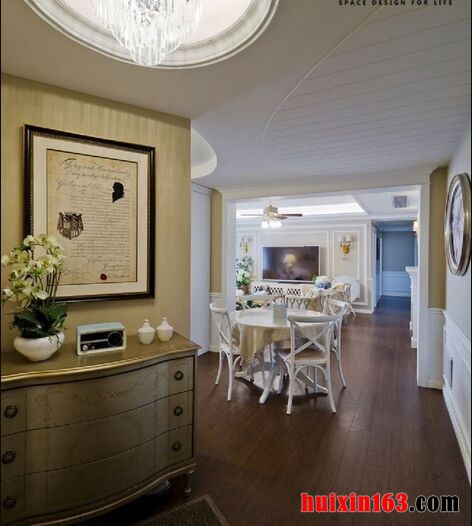 本套房屋装饰的主色彩是以白色为主,偶尔使用了鲜艳的色彩做点缀,客厅中石膏板吊顶上的装饰比较简单,不需要过多的造型设计便可以将中间那盏别致的吊灯衬托出来,电视背景墙上的装饰比较简洁,但并不失美感,米色的壁纸铺贴了墙面,使用了白色的石膏线条做了简单的设计,并在两侧安装了一组墙壁灯,更体现了对称的美感,电视下方摆放了一款带有镂空图案的电视柜,整体设计感与本套房屋装饰的主题十分相符,不仅为客厅设计增强了美感,更为客厅增添了一定的收纳空间,与之相对的沙发背景墙的装饰则更加富有意义,做出了照片墙的设计,多幅相框随意悬挂,照片上则是家人在一起的幸福时光,这样的设计更为客厅空间增添了一丝温馨、甜蜜之意。
