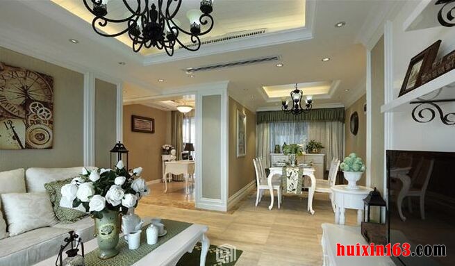 本套房屋装饰的风格比较适合大城市中的年轻人,在注重质感的同时有添加了许多时尚的元素,使房屋看起来不仅舒适而且也非常的具有设计感,一款纯白色的布艺沙发靠墙而放,米黄色的背景墙上悬挂了一幅以钟表为主题的装饰画,可以带给人们无限的幻想,同时也可以凸显出房屋主人的品味,宽大的落地窗前悬挂了一幅绿色带有碎花图案的布艺窗帘,整体效果个以带给人们一种非常清新的感觉,餐厅与客厅相连装饰的主色彩依然使用了白色,加入了青葱的绿色做点缀,是餐厅空间显得非常干净,而且也可以带给人们一种清新感,一款白色的长条餐桌的两侧搭配了同一款式的座椅,使整间餐厅都显得非常高档、大气。