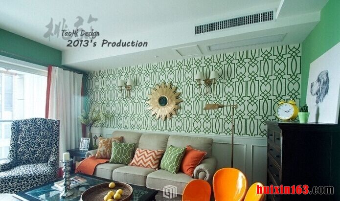 本套房屋装饰的主题是以清新为主,客厅中装饰的色彩主要是以白色和绿色为主,石膏板吊顶上没有做过多的造型设计,使其显得更加大气,沙发背景墙上则粘贴了一款白底带有绿色花纹的壁纸做装饰,并在上面安装了一组墙壁灯,使其显得更加富有浪漫情调,一款淡灰色的沙发靠墙而放,上面搭配了橘黄以及绿色的抱枕,柔软的质地加上清新的色彩,可以带给人们无限的舒适感,客厅中的墙壁主要是以绿色为主,电视背景墙也没有过多的修饰,只是在电视下方摆放了一款黑色实木材质的电视柜,与一旁的格架十分协调,这样的设计不仅增强了美感,更为客厅增加了收纳功能,餐厅中的装饰依然是以绿色和白色为主,这样的色彩搭配可以带给人们一个干净、舒适的用餐空间,业余本套房屋装饰的主题十分相符。