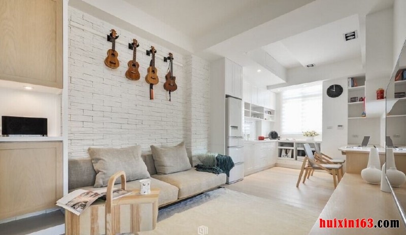 本套房屋装饰的主色彩是以白色为主,客厅中的装饰多以原木为主,可以在纯净的空间内,带给人们一丝自然的感觉,沙发背景墙的装饰比较简单,由于业主比较喜欢音乐,也从事着这方面的工作,所以设计师也将此融入在了设计当中,可以增加客厅装饰的设计感,同时也可以像来客们展现出业主的喜好,书房的设计也没有添加过多的装饰,可以带给人们一种自然的亲切感,在墙壁上做出格架的设计,也可以有效的节省房屋的使用面积,而且这样的设计也比较复合现代家居装饰的风格,卧室与客厅相连,只是简单的打了隔断,可以节省更多的空间,同时这样的设计也具有一定的装饰美感,卧室内的装饰都比较注重质感,柔软舒适的床饰搭配上原木淡淡的色彩自然可以营造出一个舒适、温馨的休息空间。