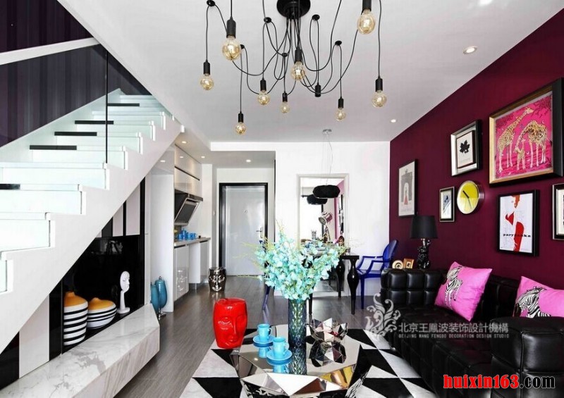 本套房屋装饰在色彩的运用上比较大胆,客厅中的主色彩是以白色以及紫色为主,艳丽的色彩可以带来视觉的冲击,同时也可以起到一定的装饰效果,石膏板吊顶上采用了平顶式的设计,这样可以更好的将吊灯的设计感衬托出来,一款黑色的皮质沙发靠墙而放,高档的材质搭配上经典的设计感,更是将典雅的设计感全部都展现了出来,背景墙上则刷涂了紫色的墙壁漆,这样的设计更加具有现代感,墙壁上悬挂了几幅大小不一的装饰画,更为客厅装饰增添了美感,同时这样的装饰也比较复合现代房屋装饰的特点,深受年轻人喜爱,一款黑白相间的局部地毯装饰着地面,在视觉上也可以带给人们很强的冲击力。