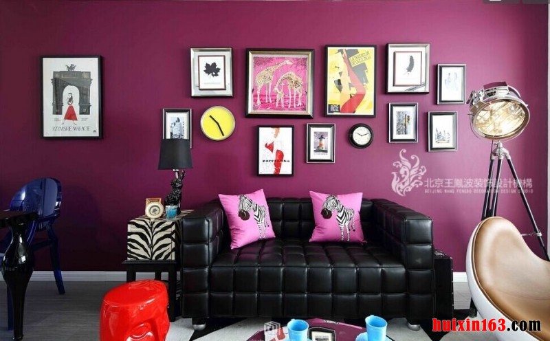 本套房屋装饰在色彩的运用上比较大胆,客厅中的主色彩是以白色以及紫色为主,艳丽的色彩可以带来视觉的冲击,同时也可以起到一定的装饰效果,石膏板吊顶上采用了平顶式的设计,这样可以更好的将吊灯的设计感衬托出来,一款黑色的皮质沙发靠墙而放,高档的材质搭配上经典的设计感,更是将典雅的设计感全部都展现了出来,背景墙上则刷涂了紫色的墙壁漆,这样的设计更加具有现代感,墙壁上悬挂了几幅大小不一的装饰画,更为客厅装饰增添了美感,同时这样的装饰也比较复合现代房屋装饰的特点,深受年轻人喜爱,一款黑白相间的局部地毯装饰着地面,在视觉上也可以带给人们很强的冲击力。