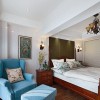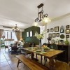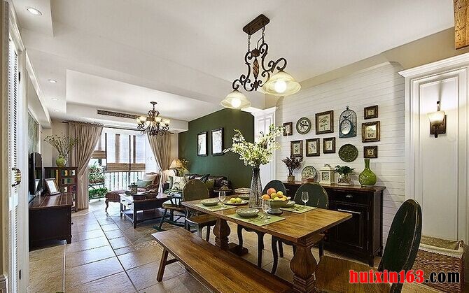本套房屋装饰中客厅的装饰色彩主要是以白色以及绿色为主,沙发背景墙上刷涂了绿色的乳胶漆,并在上面悬挂了两幅装饰画,一款黑色的皮质沙发靠墙而放,高档的材质使其显得更加高档,搭配上浅绿色的布艺抱枕,更是将舒适感完全展现了出来,一款实木材质的茶几摆放在客厅中间,大方的造型却有着精细的做工处理,边角以及抽屉处的设计欧非常的独特,一旁搭配了一款蓝色的木质座椅,上面搭配了布艺的做垫以及靠垫,使其显得更加舒适,也比较具有田园风格的特点,餐厅与客厅在同一空间内,却利用了吊顶造型设计巧妙的将空间分割开来,一套木质的 长条餐桌搭配上同一系列的座椅,这样的设计显得更加注重质感。