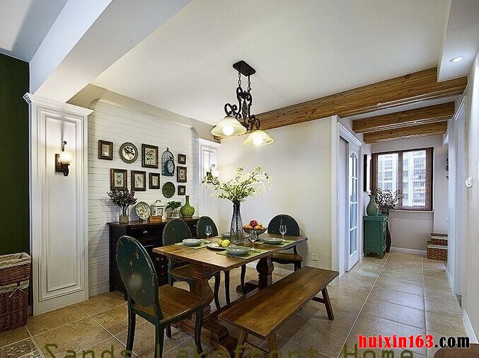 本套房屋装饰中客厅的装饰色彩主要是以白色以及绿色为主,沙发背景墙上刷涂了绿色的乳胶漆,并在上面悬挂了两幅装饰画,一款黑色的皮质沙发靠墙而放,高档的材质使其显得更加高档,搭配上浅绿色的布艺抱枕,更是将舒适感完全展现了出来,一款实木材质的茶几摆放在客厅中间,大方的造型却有着精细的做工处理,边角以及抽屉处的设计欧非常的独特,一旁搭配了一款蓝色的木质座椅,上面搭配了布艺的做垫以及靠垫,使其显得更加舒适,也比较具有田园风格的特点,餐厅与客厅在同一空间内,却利用了吊顶造型设计巧妙的将空间分割开来,一套木质的 长条餐桌搭配上同一系列的座椅,这样的设计显得更加注重质感。