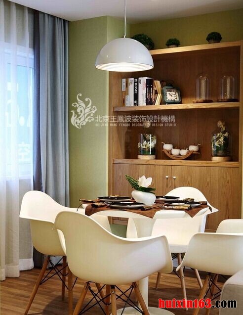 本套房屋装饰比较注重个性,客厅中的的色彩运用比较繁杂,但不会带给人们一种烦乱的感觉,反而鲜艳的色彩随意搭配在一起带给人你们一种新鲜感,沙发对面的墙壁上暂时没有安装电视,所以只是使用了木质造型的框架拼贴出了展示墙的感觉,一款白色的布艺沙发上搭配了几款色彩不一的抱枕,是沙发显得更加舒适,地面上则使用了一款白色大有灰色图案的局部地毯做装饰,为客厅空间平添了一份温馨与舒适,两个圆形的茶几摆放在中间,简单大方的设计却具有一定的实用性,可以根据人们的需求,随意的进行移动,是比较方便的设计,与本套房屋装饰的主题也十分的相符。