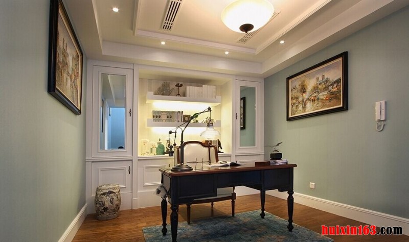 客厅中石膏板吊顶上的造型设计比较简单,平板的设计上有增添了一些条纹的设计,并在四周作了夹层设计,可以在夹层中安装一圈白色的灯带,将中间的黑色铁艺吊灯衬托的更加别致,餐厅中的石膏板吊顶比较具有设计感,中间凹槽的设计比较吸引人们的眼球,一款较长的吊灯低垂在圆形餐桌之上,整体装饰效果显得非常唯美、别致,书房中的设计比较静谧,四周的墙上没有安装窗户,可以使人们在阅读或是工作的过程中不受窗外事物的影响,一款实木材质的书桌,做工非常的精细,细节处理也非常别致,搭配在书房的环境中使其显得更加典雅、端庄。