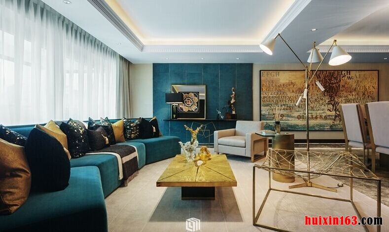 本套房屋装饰风格比较大气,客厅中的石膏板吊顶上做了简单的造型设计,并在四周的夹层中安装了一圈白色的灯带,是空间显得更加明亮,一款蓝色的沙发,摆放在窗前,上面搭配了多个不同款式的抱枕,使其装饰显得非常舒适,也为客厅增添了一份温馨,落地窗前悬挂了白色的轻质薄纱,无疑也成为了一种装饰,衬托出了沙发的设计感,同时也是客厅多了一份朦胧之意,一款木质茶几摆放在沙发中间,小巧的体积却并不缺少设计感,在起到装饰效果的同时,也为客厅空间增添了一定的收纳空间,也体现出了本套房屋设计的主题,非常符合现代房屋装饰的风格。